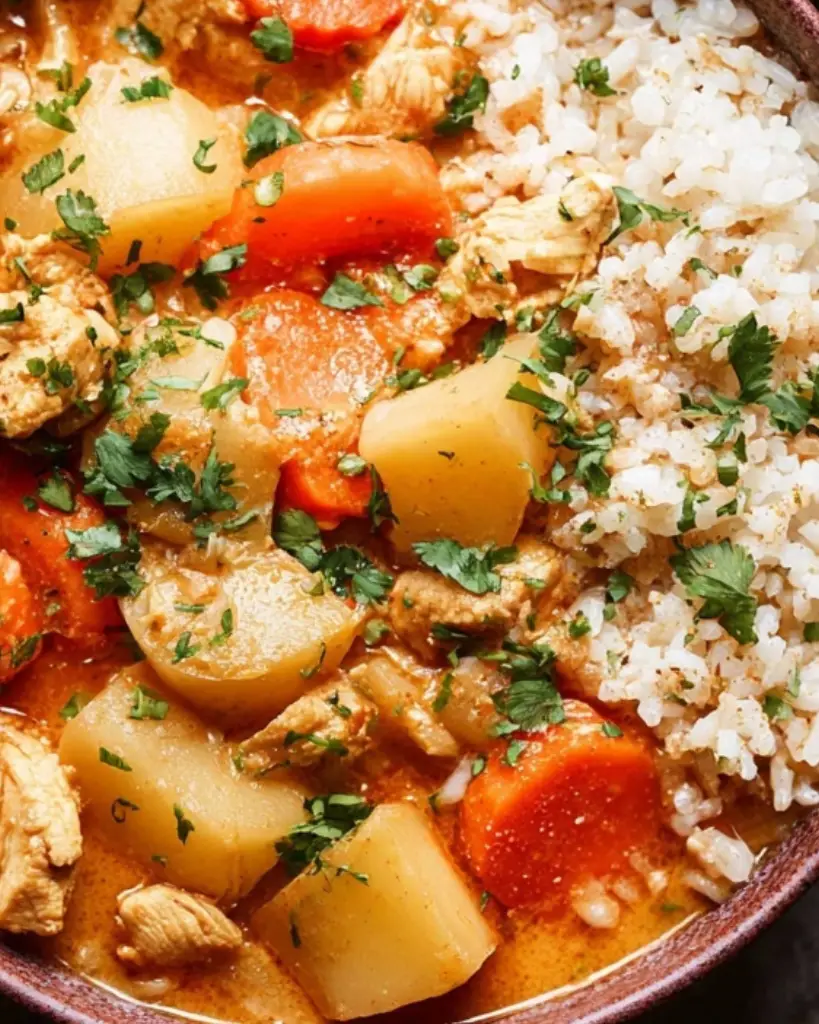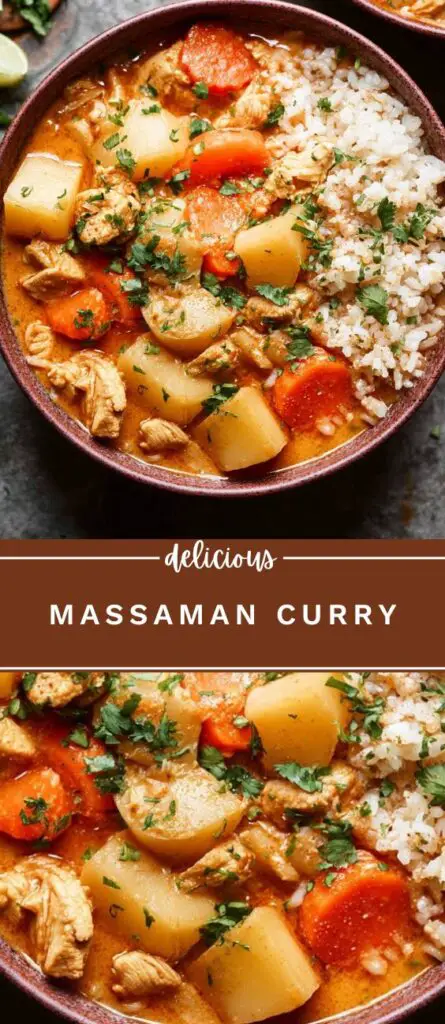 This Massaman Curry recipe is a rich and creamy Thai-inspired dish made with tender chicken, coconut milk, potatoes, and carrots simmered in a flavorful curry paste. Perfect for weeknight dinners, this easy Thai curry combines sweet, savory, and mildly spiced flavors for a comforting meal. Serve it with jasmine rice, quinoa, or noodles for a hearty and aromatic homemade curry that’s simple to prepare and full of authentic taste.