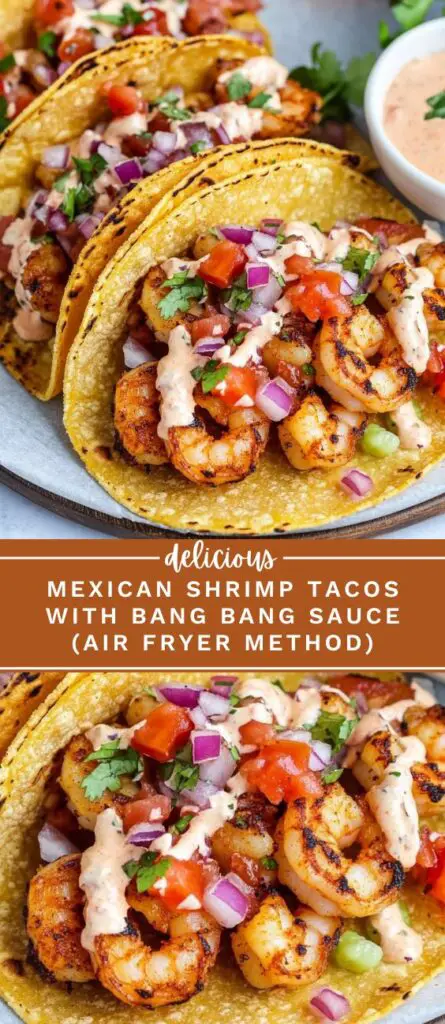 Easy air fryer Mexican shrimp tacos packed with bold spices, fresh pico de gallo, and a creamy bang bang sauce. This healthy taco recipe uses corn tortillas, garlic-seasoned shrimp, and a quick homemade sauce. Perfect for weeknight dinners, meal prep, or taco night. Gluten-free and dairy-free options included.