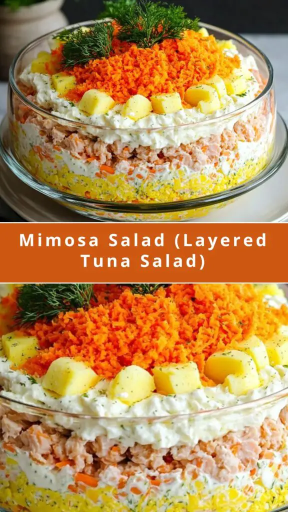 Looking for a unique, layered salad that’s perfect for your next gathering? This Mimosa Salad (also known as Layered Tuna Salad) is a delightful and colorful dish made with tender tuna, creamy mayo, hard-boiled eggs, grated vegetables, and a tangy dressing. It’s a visually stunning and flavorful dish that is ideal for holidays, parties, and potlucks. This recipe combines a variety of textures and flavors, including savory tuna, fresh veggies like boiled potatoes, carrots, and onions, all topped with a light and creamy dressing. Whether you’re looking for a light main dish or a hearty side, this Mimosa Salad will impress your guests with its layers of flavor and vibrant appearance.