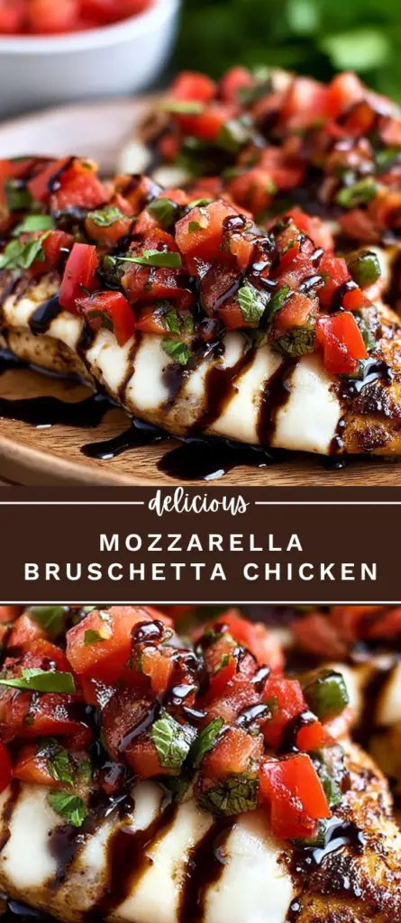 Mozzarella bruschetta chicken is a flavorful chicken dinner made with juicy pan-seared chicken breasts, fresh tomato basil bruschetta, melted mozzarella cheese, and balsamic reduction. This easy chicken recipe is perfect for weeknight meals and family dinners, pairing well with pasta, rice, or vegetables. A popular Italian-inspired chicken dish that’s fresh, simple, and full of classic flavors.