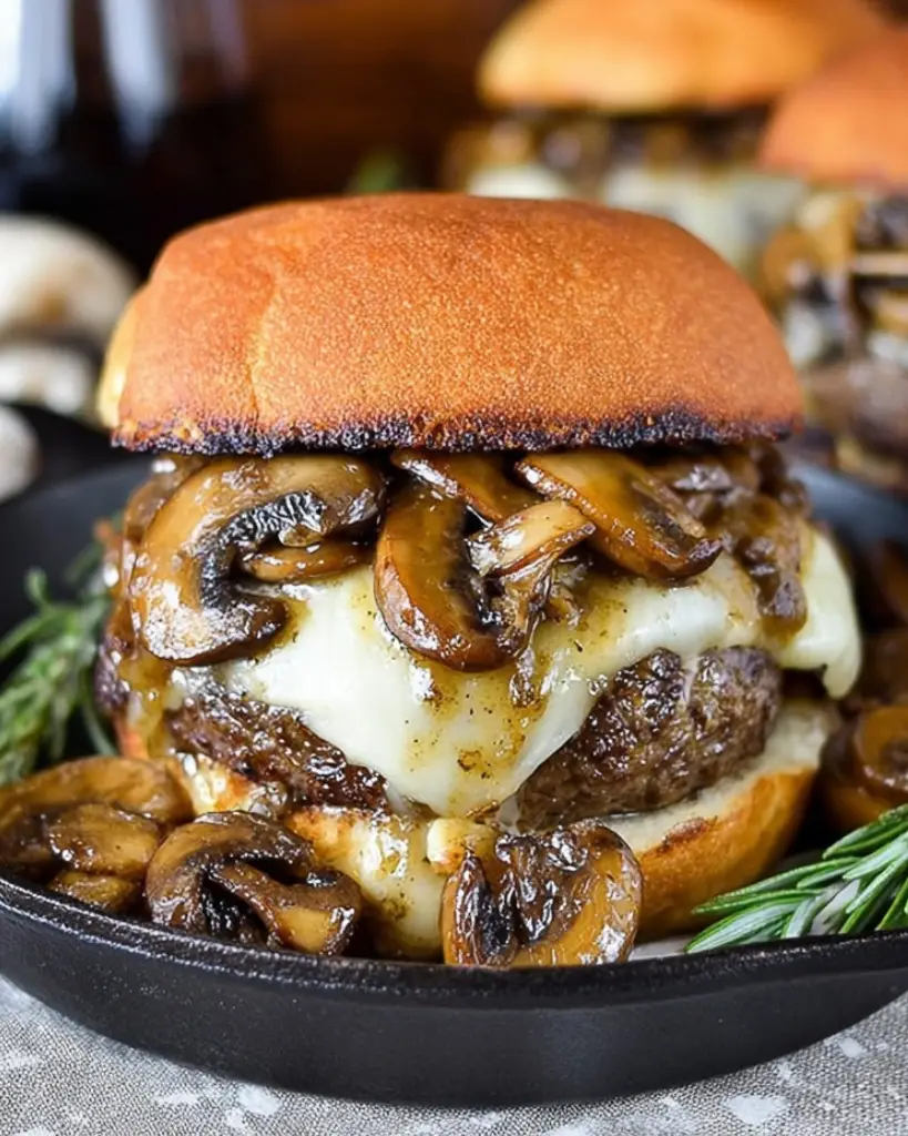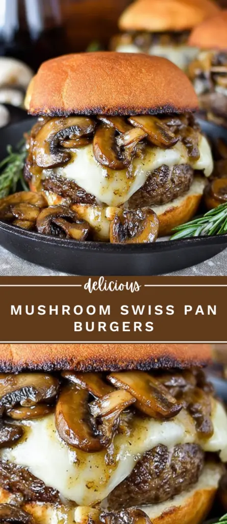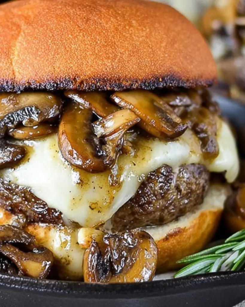 Juicy mushroom Swiss burgers cooked in a skillet and topped with a rich garlic mushroom sauce. This easy pan burger recipe uses ground beef, Swiss cheese, fresh rosemary, and beef broth for a flavorful homemade dinner. Perfect for weeknight meals, family dinners, or classic comfort food lovers looking for a simple burger recipe with mushrooms and cheese.