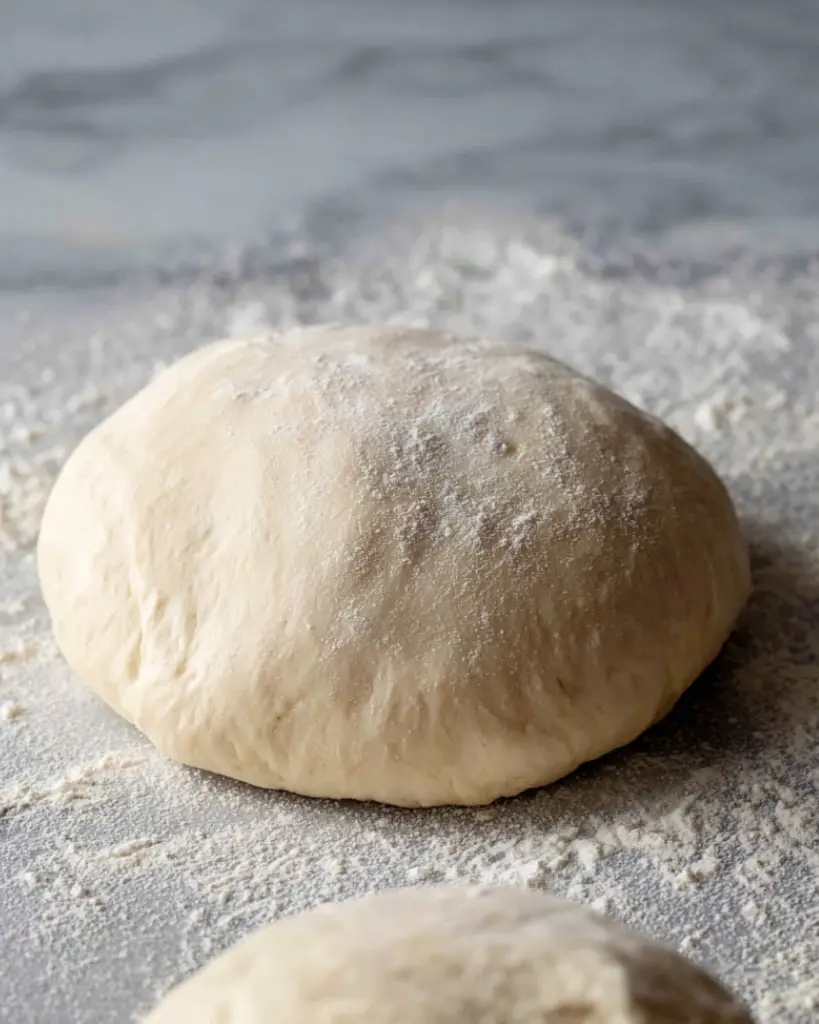 - Place one dough ball on a well-floured surface and dust the top lightly with flour.