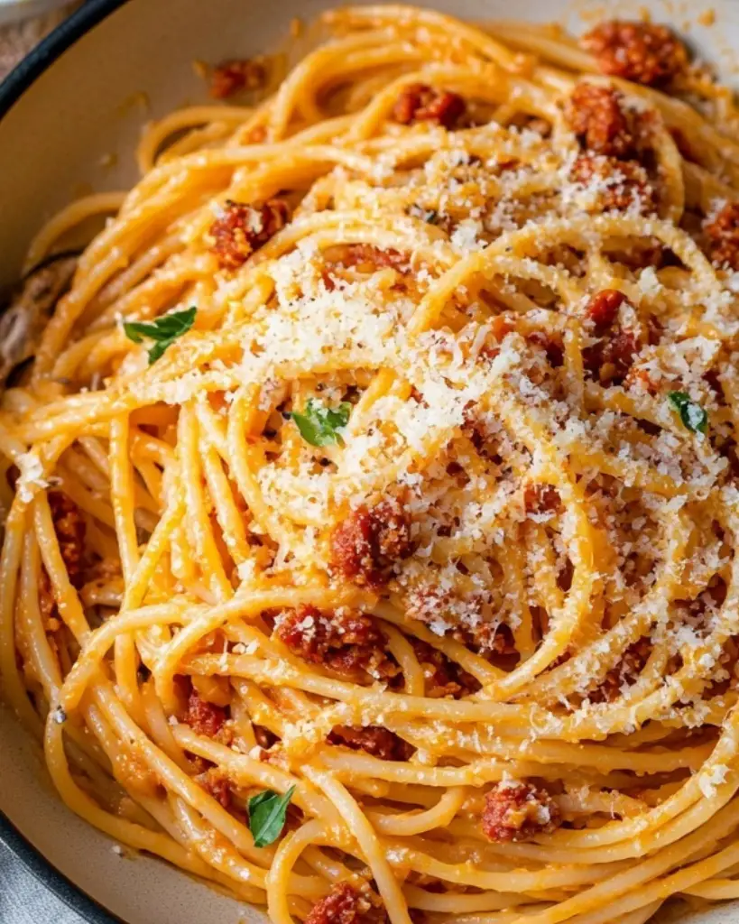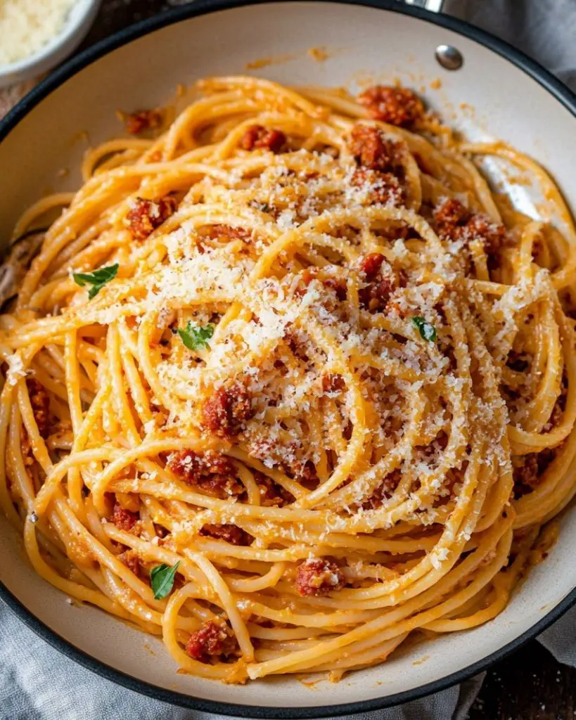 Easy one-pan chorizo spaghetti made with crispy chorizo, garlic, white wine, parmesan, and cream. This creamy pasta recipe is perfect for quick dinners and cooks entirely in one pan for minimal cleanup. Ideal for weeknight meals, comfort food lovers, and those looking for fast pasta dishes with bold flavor. Ready in 30 minutes and great for batch cooking or leftovers.