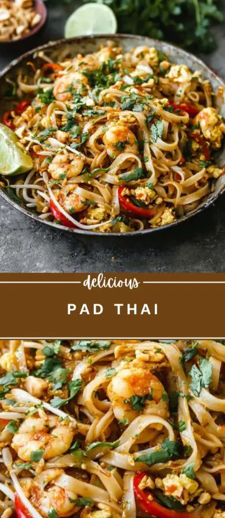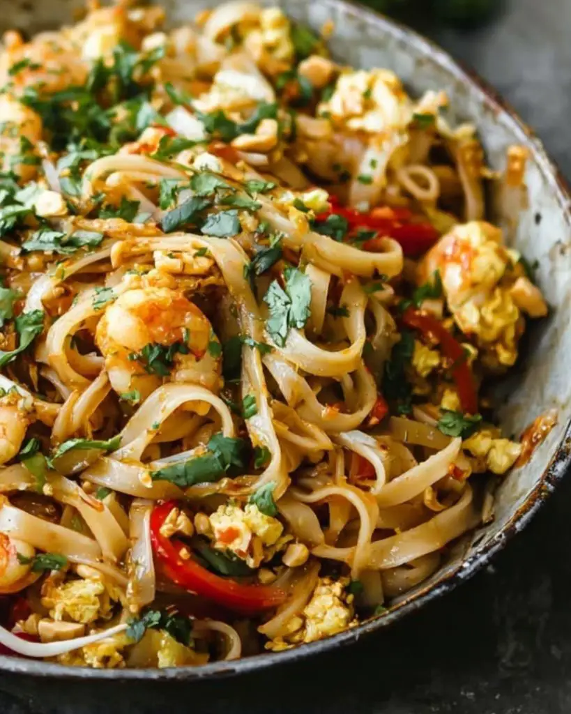 Pad Thai recipe with rice noodles, shrimp, chicken, or tofu tossed in a sweet, tangy, and slightly spicy sauce made from fish sauce, soy sauce, brown sugar, and tamarind. Stir-fried with eggs, fresh vegetables, and topped with peanuts, cilantro, and lime for an authentic Thai street food flavor at home.