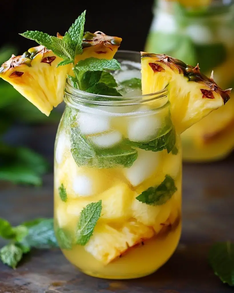 - Finish with a sprig of mint and a slice of caramelized pineapple on the rim of each glass.