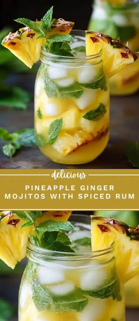 Refreshing pineapple ginger mojitos made with spiced rum, fresh mint, lime, and soda water. This easy cocktail recipe features a homemade ginger-pineapple reduction and caramelized pineapple garnish. Perfect for summer drinks, tropical parties, and rum-based cocktails. Simple to prepare, ideal for entertaining or weekend cocktails at home.