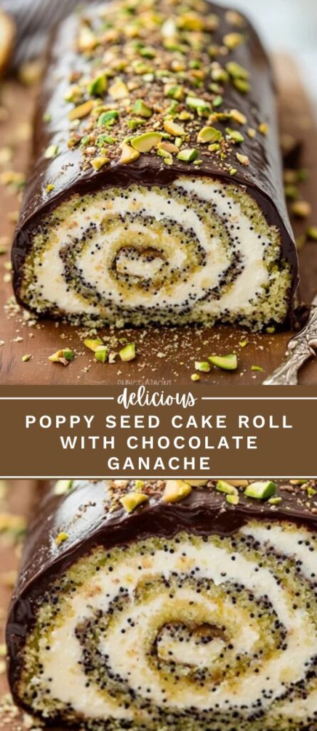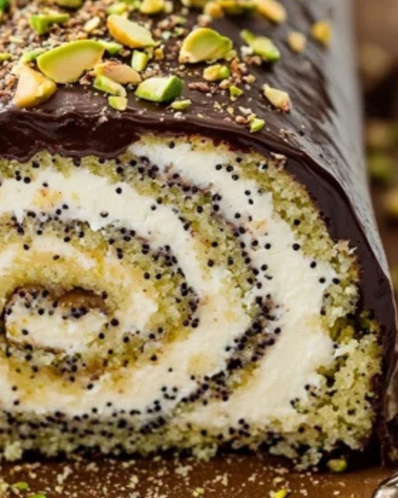 This elegant cake roll features a light sponge cake infused with poppy seeds, filled with a smooth cream cheese frosting, brushed with a rum syrup, and finished with a rich chocolate ganache and crunchy pistachios. It’s a beautiful dessert for holidays, celebrations, or anytime you want to impress.