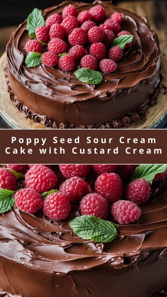 Looking for a show-stopping dessert? This Poppy Seed Sour Cream Cake with Custard Cream is the perfect combination of rich, moist cake layers, creamy custard, and silky chocolate ganache. Ideal for birthdays, holidays, or any special occasion, this indulgent cake is a treat that will impress every guest. Poppy seed cake adds a nutty crunch, while the sour cream keeps the cake moist and flavorful. The custard cream filling adds a smooth, velvety texture, and the chocolate ganache topping provides a rich finish. With a garnish of fresh raspberries, this cake is as beautiful as it is delicious.