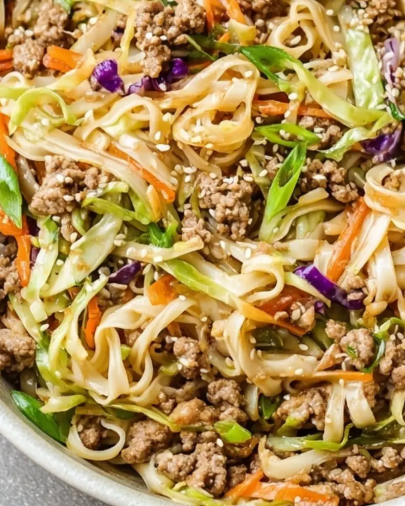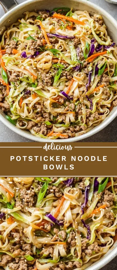 These potsticker noodle bowls bring together savory ground pork, tender rice noodles, and crisp vegetables tossed in a flavorful soy-ginger sesame sauce. Inspired by classic potstickers, this one-pan meal is quick to prepare and perfect for busy weeknights.