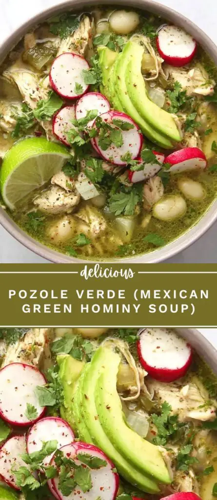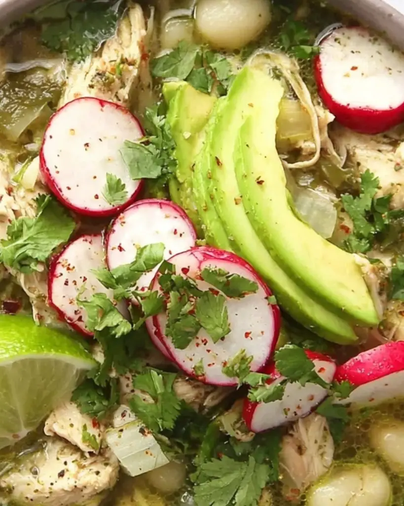 Pozole Verde is a traditional Mexican soup made with tender chicken, roasted green chiles, tomatillos, and hominy in a rich, flavorful broth. This easy one-pot recipe is perfect for family dinners or gatherings, topped with fresh cabbage, radishes, avocado, and lime for authentic Mexican flavor.