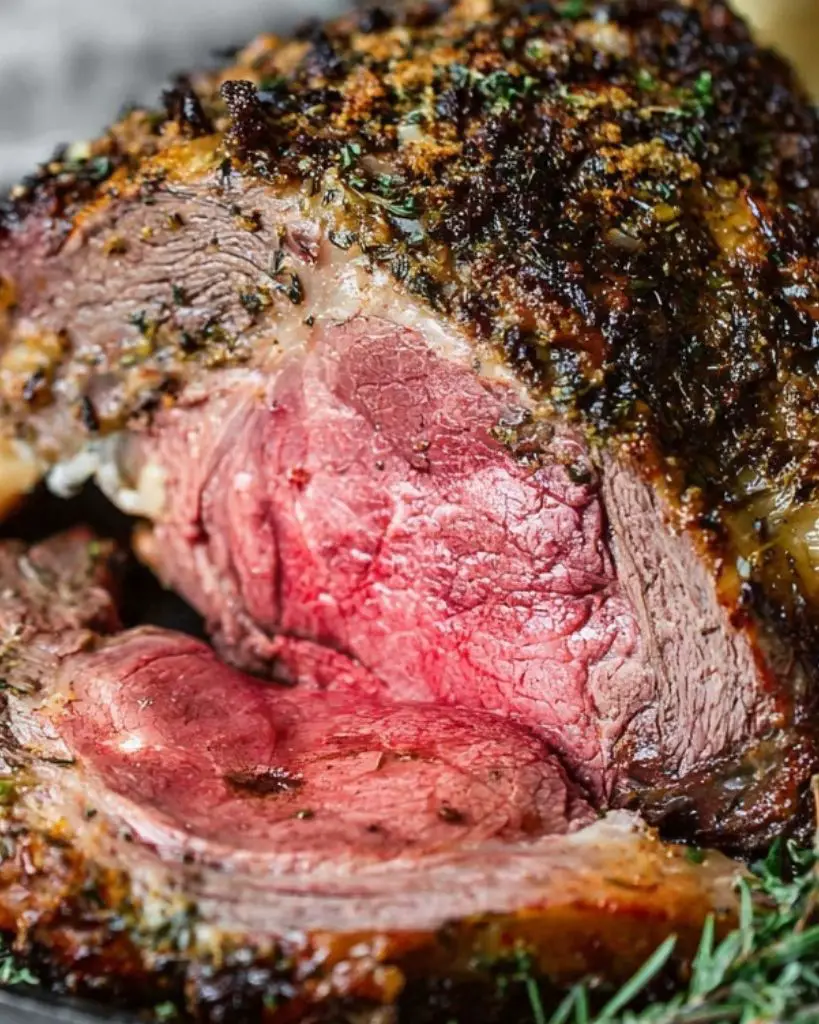 Prime rib roast recipe with garlic, rosemary, and thyme, cooked to perfection for tender, juicy meat with a flavorful crust. This easy method uses a high-heat sear followed by slow roasting for consistent results. Perfect for holidays, special occasions, and family gatherings.