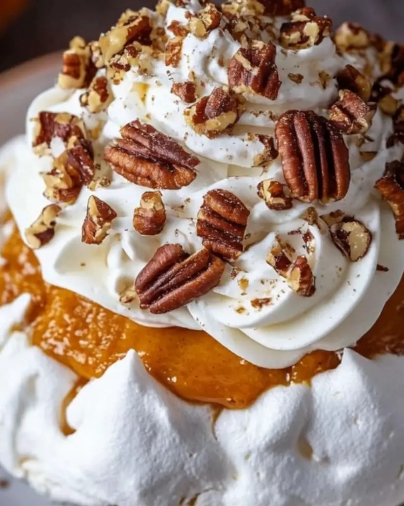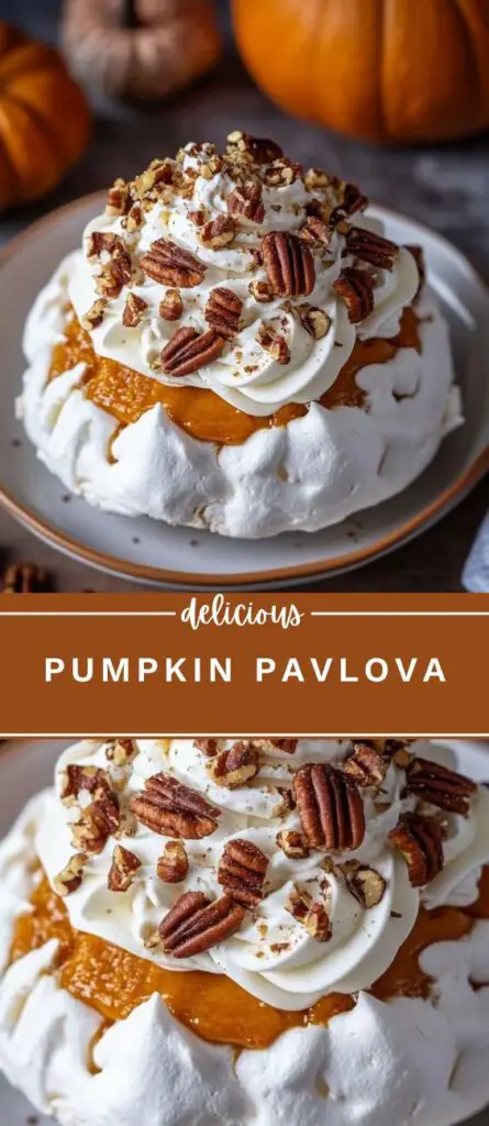 Pumpkin Pavlova is a light, crisp meringue dessert topped with creamy pumpkin spice curd, whipped cream, and crunchy pecans. This fall dessert recipe is perfect for Thanksgiving, autumn parties, and festive holiday tables. Made with simple ingredients, it offers a unique way to use pumpkin in a non-pie dessert.