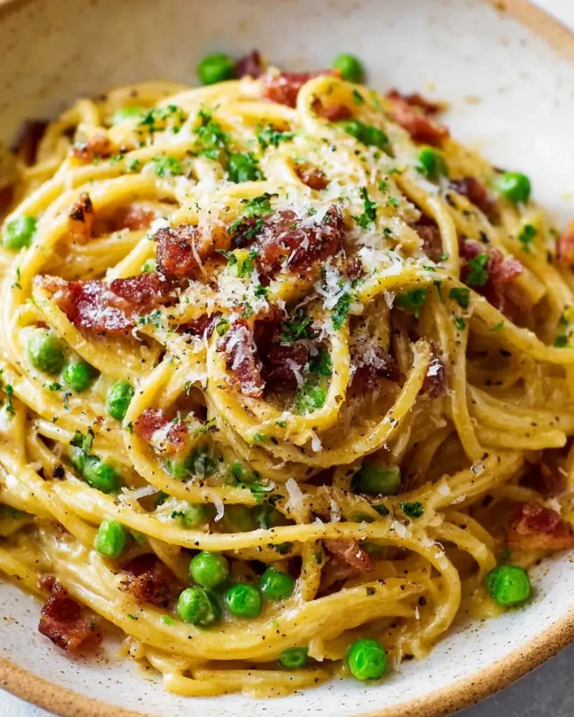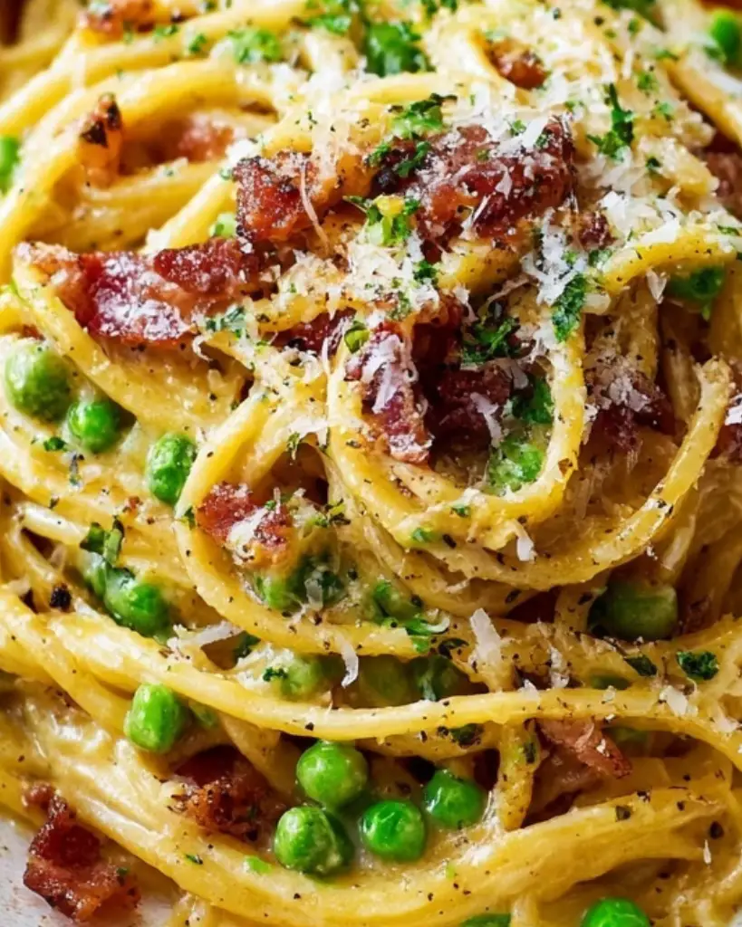 Quick pasta alla carbonara with peas and bacon, made with crispy bacon, al dente pasta, eggs, Pecorino Romano, and Parmesan cheese. This easy Italian pasta recipe delivers a creamy carbonara sauce without cream, using classic techniques and simple ingredients. Perfect for busy weeknights, family dinners, or quick comfort meals, this bacon carbonara with peas is rich, flavorful, and ready in under 30 minutes. A popular homemade pasta dish combining traditional Italian flavors with a modern twist.