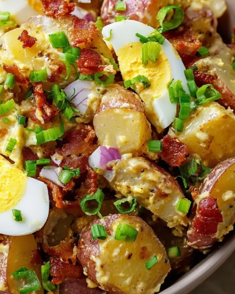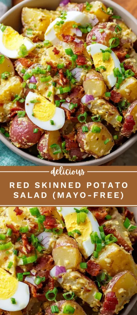 Mayo-free red skinned potato salad made with baby red potatoes, crispy bacon, hard-boiled eggs, green onions, and a honey Dijon vinaigrette. This easy potato salad recipe is perfect for summer barbecues, picnics, and potlucks. Lighter than classic potato salad, it pairs well with grilled meats and makes a flavorful side dish that can be prepared ahead of time.