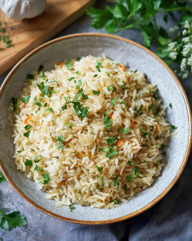 Recette facile de riz pilaf maison, préparé avec du riz long grain, du bouillon de poulet ou de légumes, des oignons, de l’ail et du persil frais. Un accompagnement léger, parfumé et savoureux, parfait pour les repas en famille, les plats méditerranéens ou pour remplacer le riz nature.