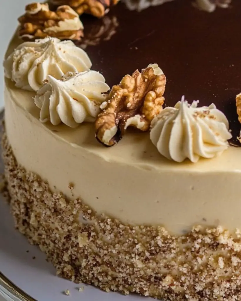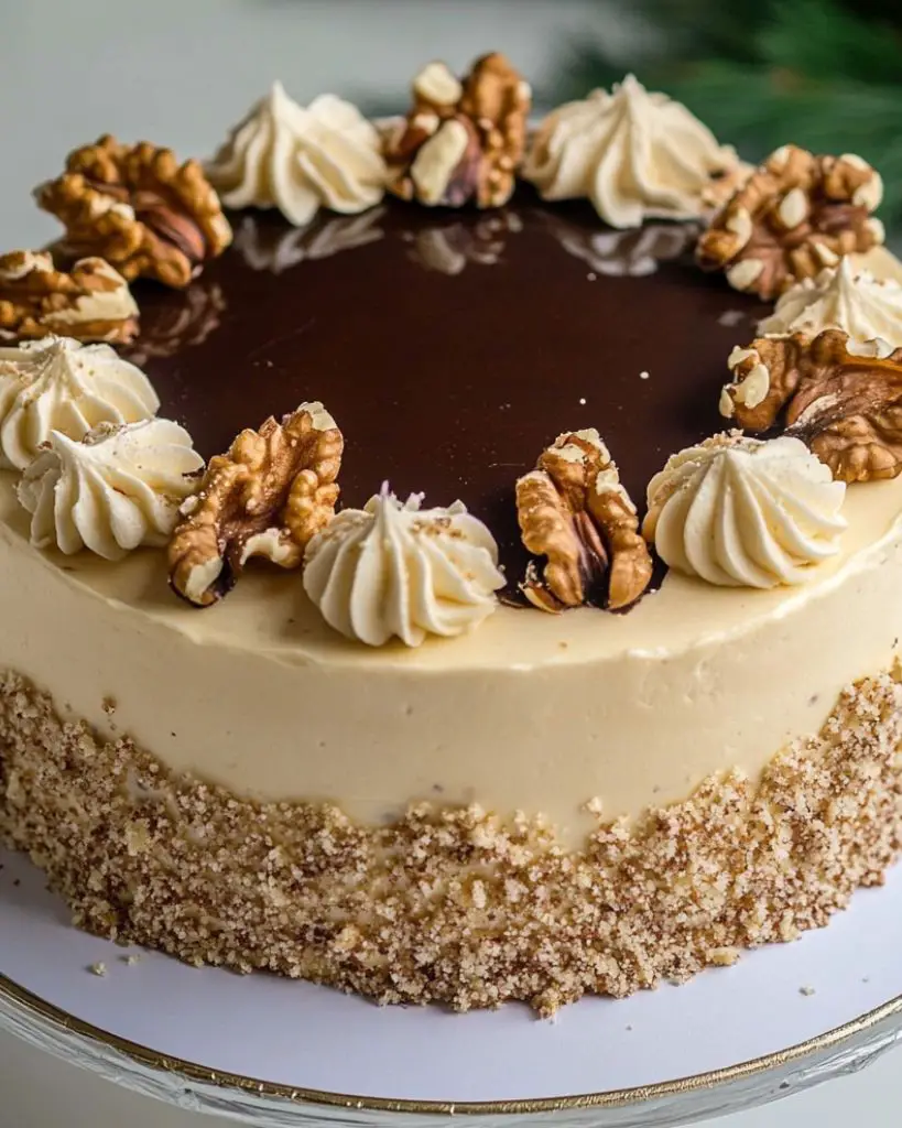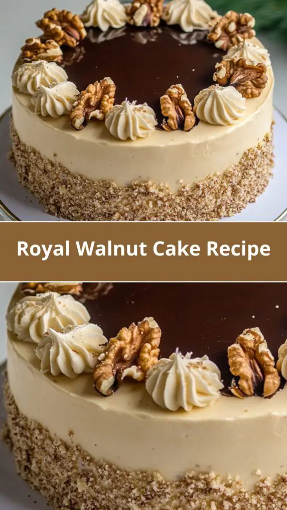 This Royal Walnut Cake is a decadent and elegant dessert featuring layers of soft, nutty sponge cake, luscious Russian buttercream, and a rich chocolate ganache. Infused with a touch of rum syrup, this cake is a show-stopping treat perfect for holidays and special occasions.