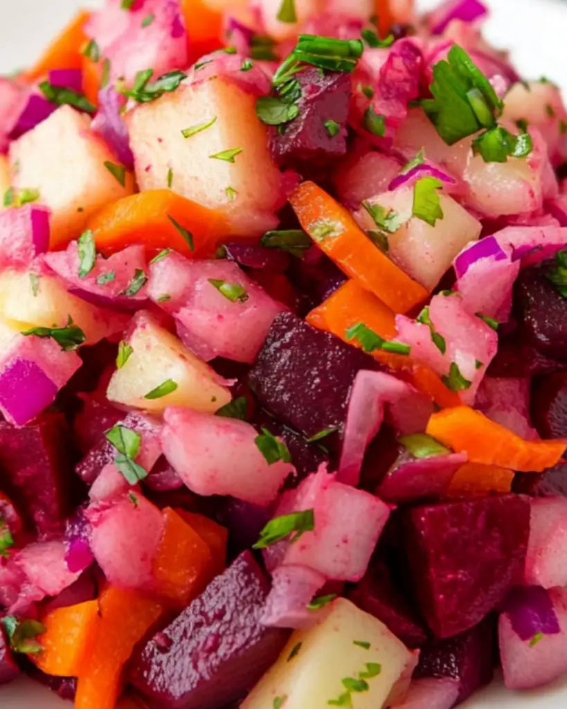 Discover the classic Russian Vinaigrette salad recipe with beets, potatoes, carrots, and tangy sauerkraut. This healthy and easy-to-make dish combines simple ingredients into a flavorful, vibrant salad perfect for any occasion. Whether you’re looking for a nutritious side dish, a vegan salad, or a tangy appetizer, this recipe delivers a refreshing combination of flavors. The addition of pickles and onions adds a zesty kick, making this vinaigrette a favorite at potlucks, holiday dinners, and family gatherings. Learn how to make this delicious, traditional Russian salad with step-by-step instructions for the perfect texture and taste.
