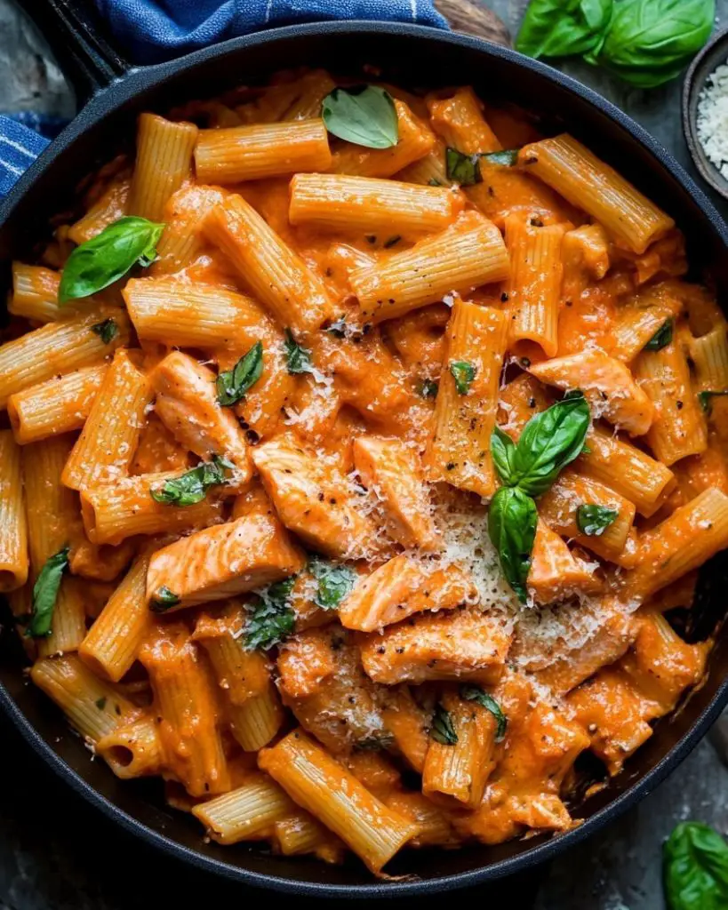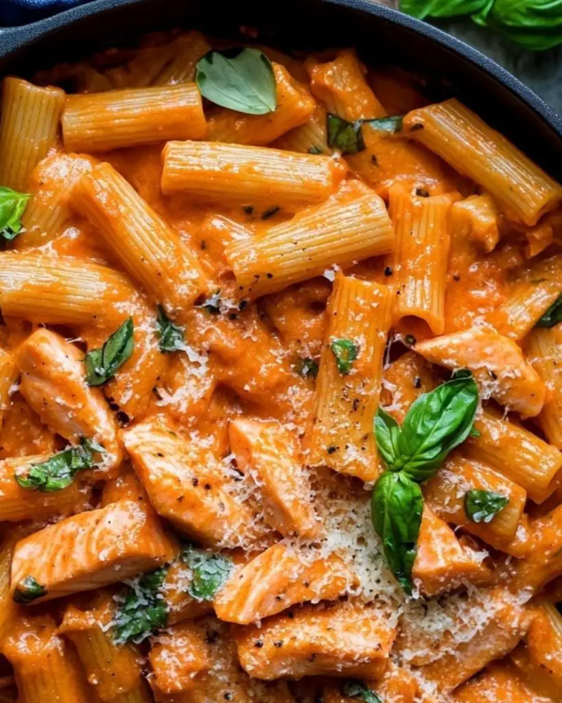A rich and comforting pasta dish featuring tender salmon in a smooth tomato and cream sauce. This easy weeknight dinner brings together simple ingredients to create a flavourful, satisfying meal the whole family will enjoy.