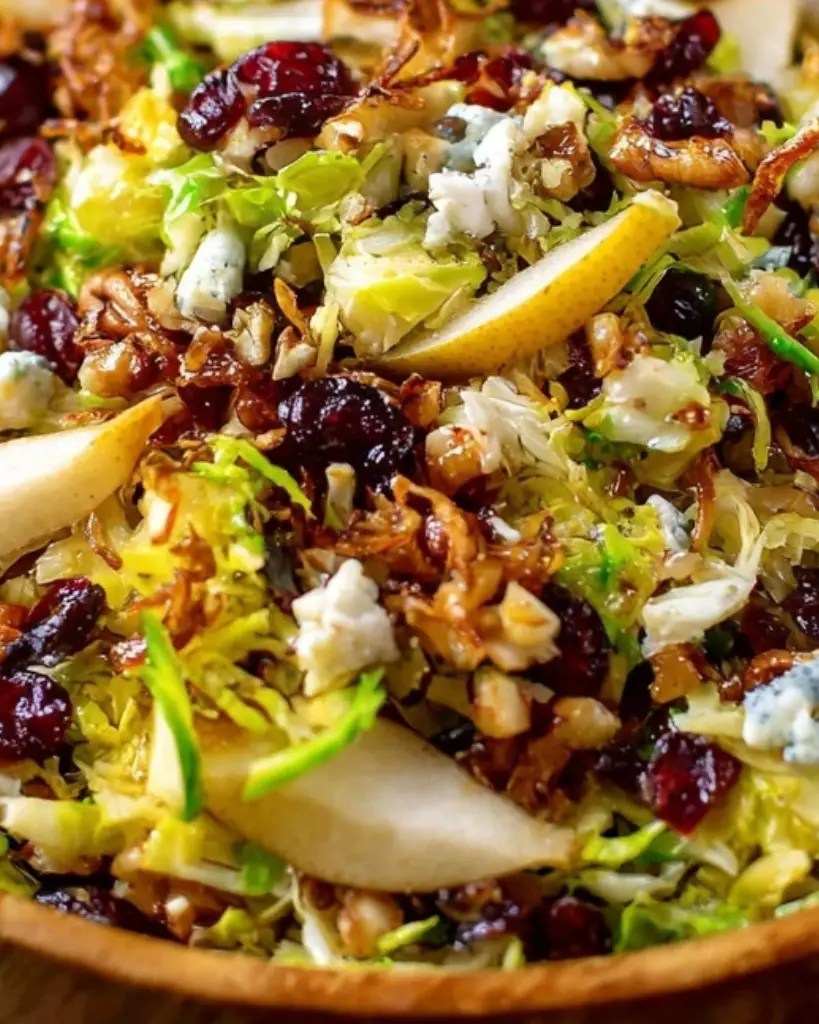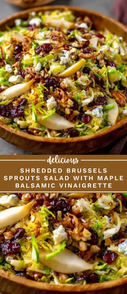 Shredded Brussels sprouts salad with dried cranberries, pecans, gorgonzola, and fresh pear, tossed in a maple balsamic vinaigrette. This healthy, fresh salad features crispy fried shallots for extra flavor and is perfect for quick lunches, holiday sides, or light dinners. Ideal for gluten-free and vegetarian meals with a mix of sweet, tangy, and savory flavors.