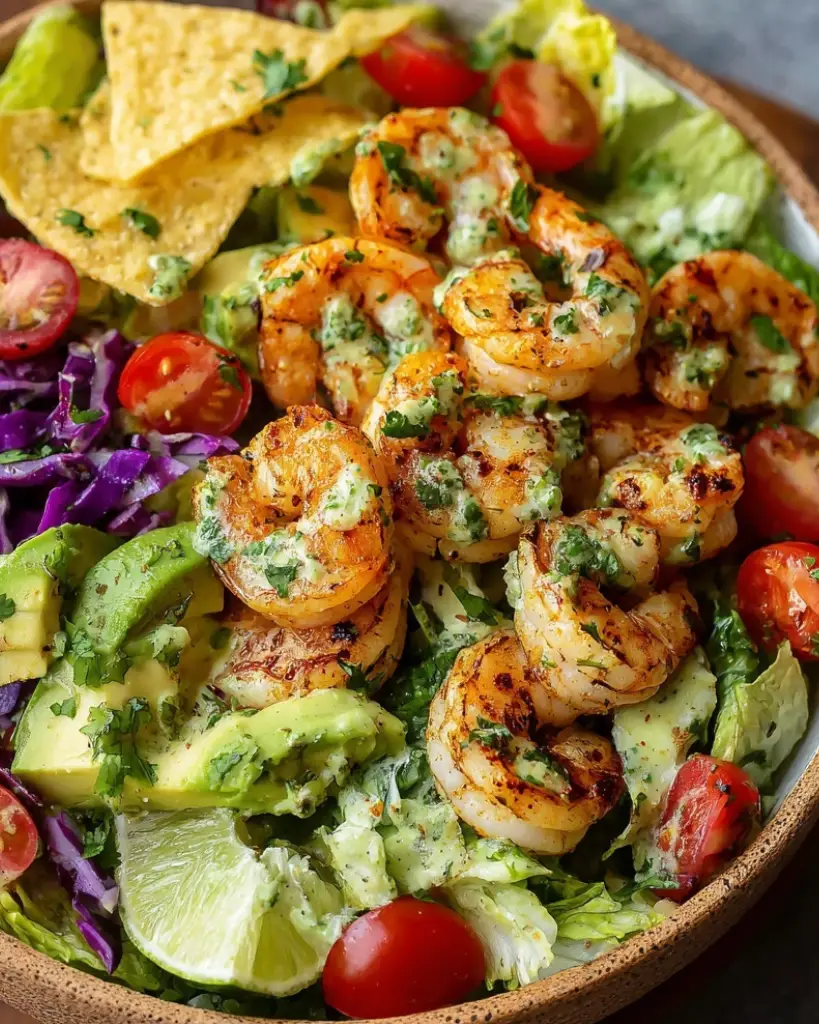This shrimp and avocado taco salad is a fresh and healthy meal made with cilantro lime shrimp, crisp romaine lettuce, red cabbage, cherry tomatoes, and creamy avocado. Light yet filling, this gluten-free salad features a homemade cilantro lime dressing and crunchy tortilla chips. Perfect for lunch or dinner, this easy shrimp salad recipe is packed with protein, bold flavors, and simple ingredients, making it ideal for quick meals and warm-weather eating.