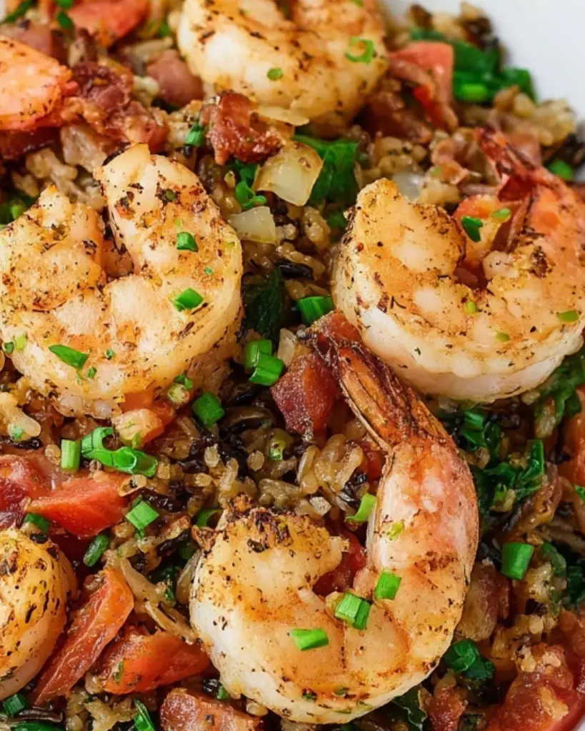 Shrimp and wild rice skillet is an easy one-pan dinner made with jumbo shrimp, wild rice blend, spinach, bacon, garlic, and fresh tomato. This healthy shrimp recipe combines tender seafood with hearty whole grains and vegetables for a balanced meal. Perfect for quick weeknight dinners, this shrimp and rice skillet is packed with protein, simple ingredients, and fresh flavors, making it a great option for family meals or meal prep.
