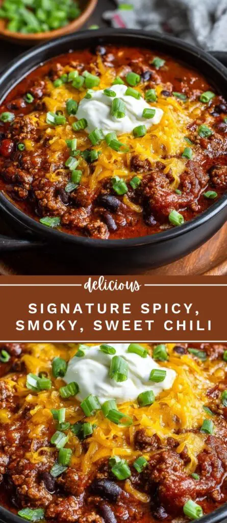 Signature Spicy, Smoky, Sweet Chili recipe with ground beef, black beans, baked beans, and rich tomato sauce. This easy chili is perfect for weeknight dinners, meal prep, or cozy gatherings. Made with chili powder, smoked paprika, brown sugar, and a touch of cayenne for balanced heat, it can be cooked on the stove or in a crock pot. Top with shredded cheddar, green onions, sour cream, or tortilla chips for a hearty, flavorful meal.