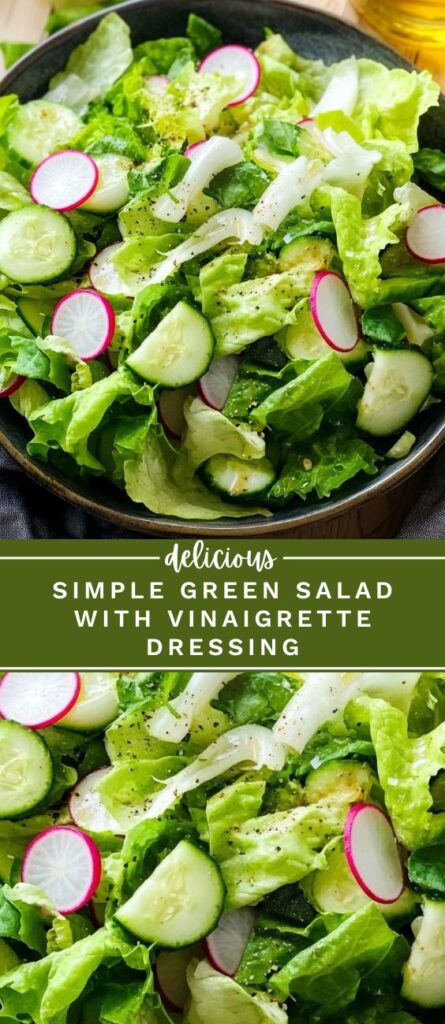 This crisp, fresh green salad features a mix of leafy greens, crunchy vegetables, and a zesty homemade vinaigrette. Perfect as a side dish for everyday meals or as a light starter, this salad is quick to prepare and full of texture and flavor.