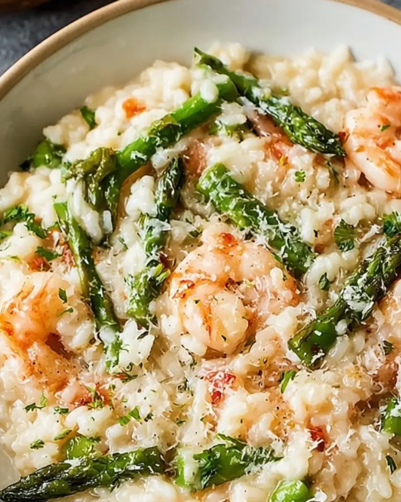 - Creamy risotto with tender shrimp and fresh asparagus.