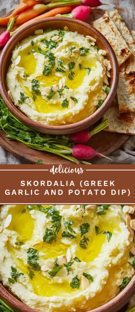 Traditional Greek Skordalia with garlic, potatoes, and almonds. Creamy, flavorful dip perfect for vegetables, pita bread, or as a sauce for grilled fish and roasted dishes. Easy homemade Mediterranean recipe with fresh lemon juice and olive oil.