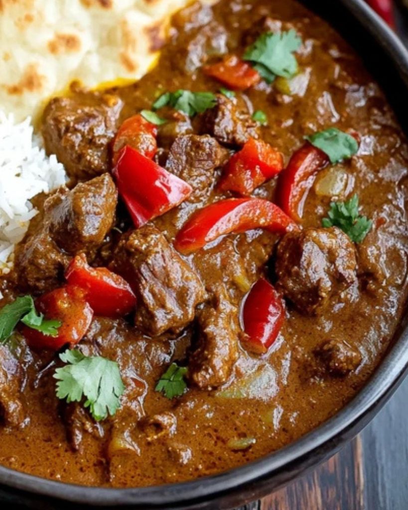This slow cooker beef coconut curry is a flavorful and comforting meal made with tender braising beef, red peppers, garlic, ginger, curry paste, chopped tomatoes, and creamy coconut milk. Perfect for busy weeknights or family dinners, this easy beef curry simmers slowly for melt-in-your-mouth texture and rich taste. Serve with basmati rice and naan for a complete Indian-inspired dish.