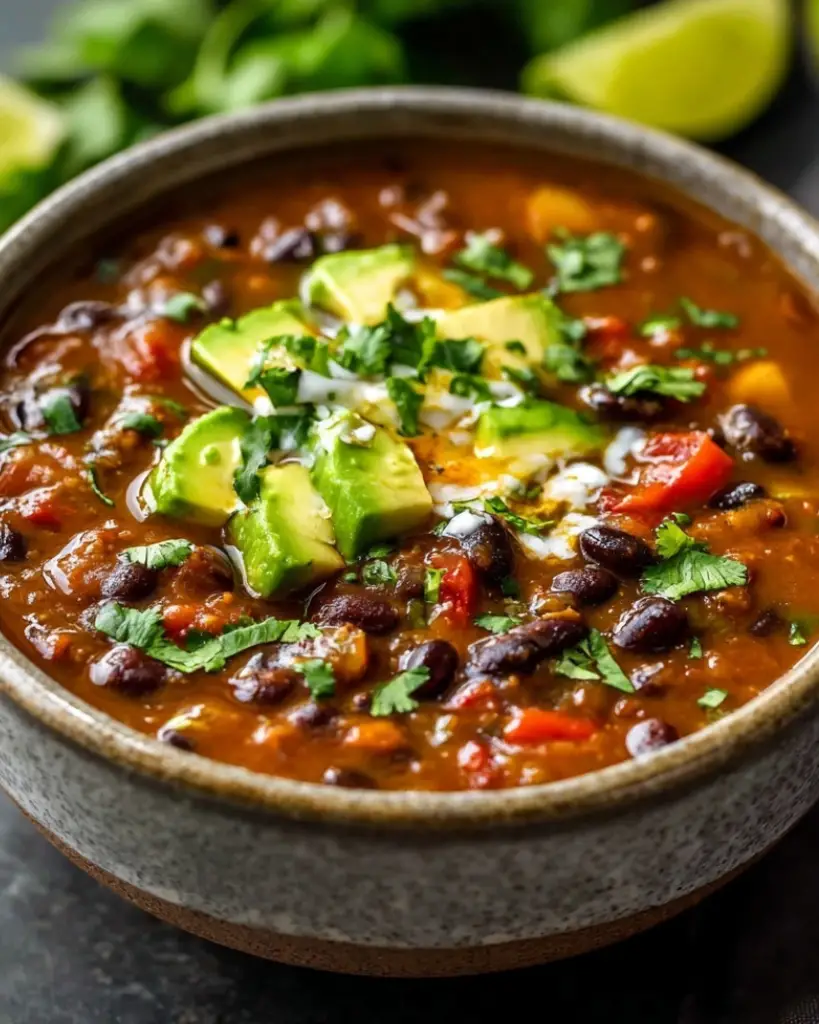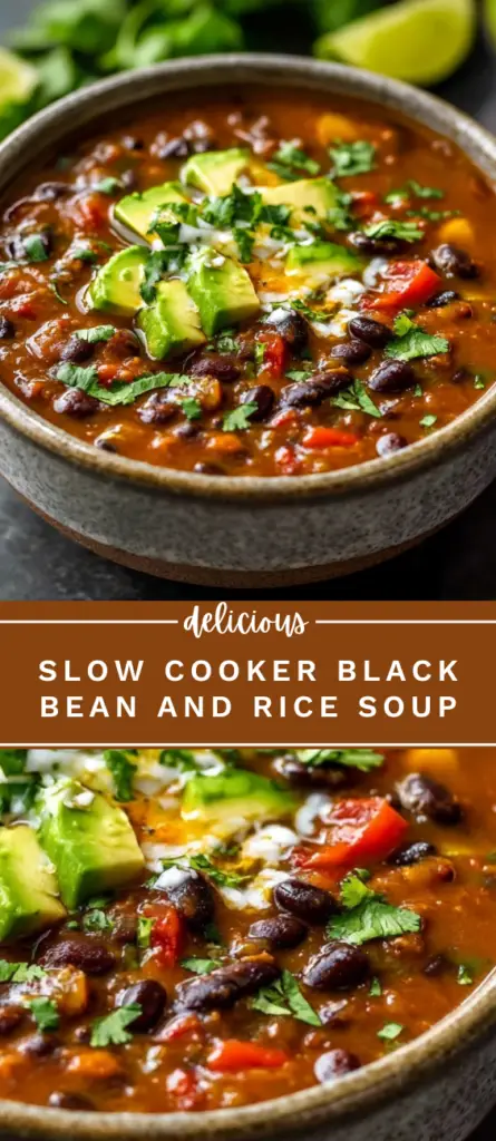 Slow cooker black bean and rice soup made with pantry staples, bell peppers, jalapeños, and warm spices. This healthy black bean soup recipe is naturally gluten-free, hearty, and filling, with a thick and creamy texture. An easy crockpot soup ideal for meal prep, busy weeknights, and cozy dinners, topped with avocado, tortilla chips, or fresh cilantro.