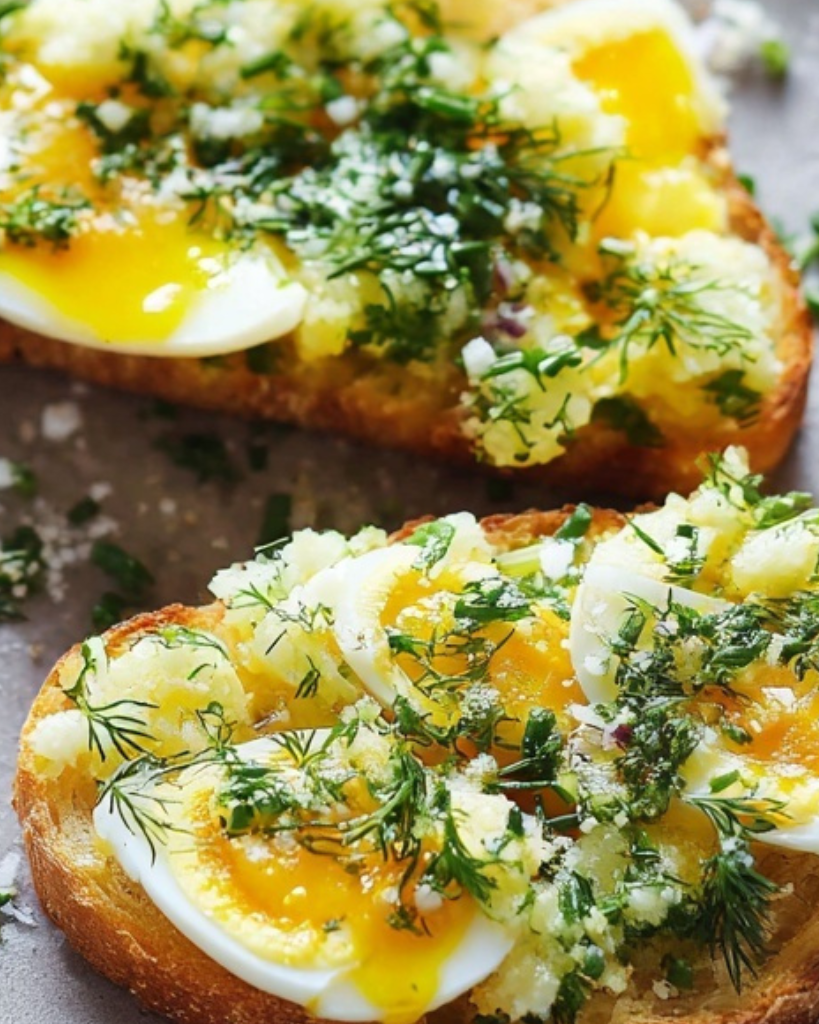- Vegan option: Use mashed avocado instead of eggs for a green herb toast.