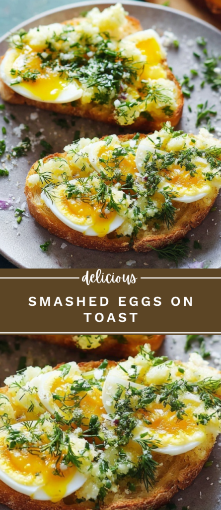 Creamy smashed eggs on toast made with soft-boiled eggs, fresh bakery bread, and a mix of chopped herbs like parsley, dill, and chives. This easy breakfast recipe features buttery toast topped with gently smashed eggs, sprinkled with flaky sea salt and aromatic herbs for a flavorful, quick morning meal. Perfect for brunch, breakfast, or a simple egg toast recipe, it combines soft, creamy eggs with crisp toast for a satisfying texture and fresh, bright taste.