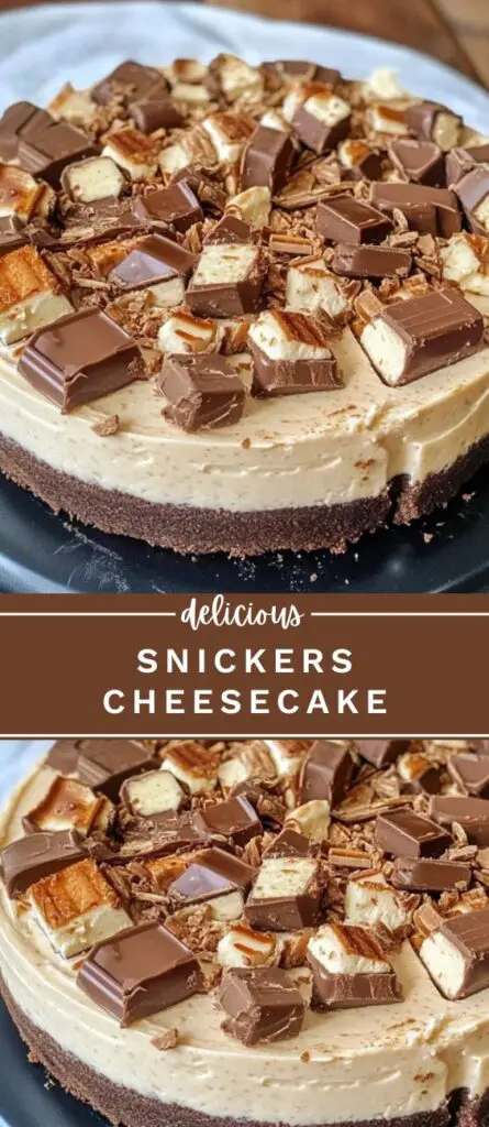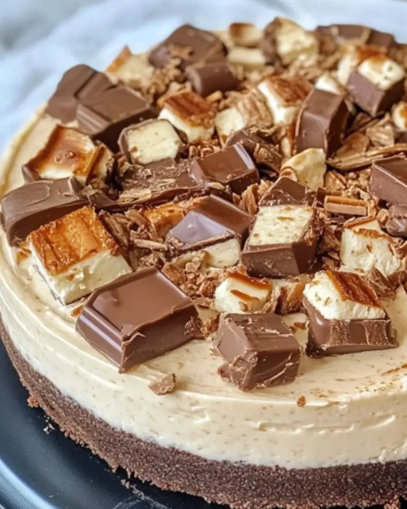 A decadent no-bake cheesecake loaded with rich milk chocolate, creamy filling, and chunks of Snickers bars — the ultimate dessert for peanut and caramel lovers.