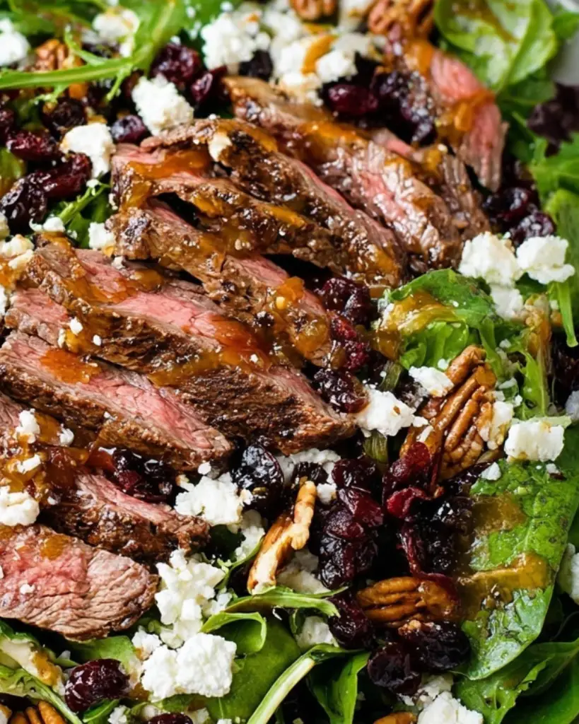 This steak salad with maple balsamic vinaigrette features tender seared steak, mixed greens, goat cheese, candied pecans, and dried cherries for a flavorful main dish salad. Made with a homemade maple balsamic dressing, this easy steak salad recipe is perfect for lunch or dinner and works well for meal prep or special occasions. A balanced salad combining protein, fresh greens, and sweet-savory toppings.