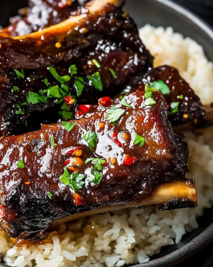 These tender short ribs are slow-cooked to perfection in a flavorful broth, then crisped up and coated in a sticky, sweet, and spicy glaze. A satisfying dish packed with bold, aromatic flavors and melt-in-your-mouth texture.