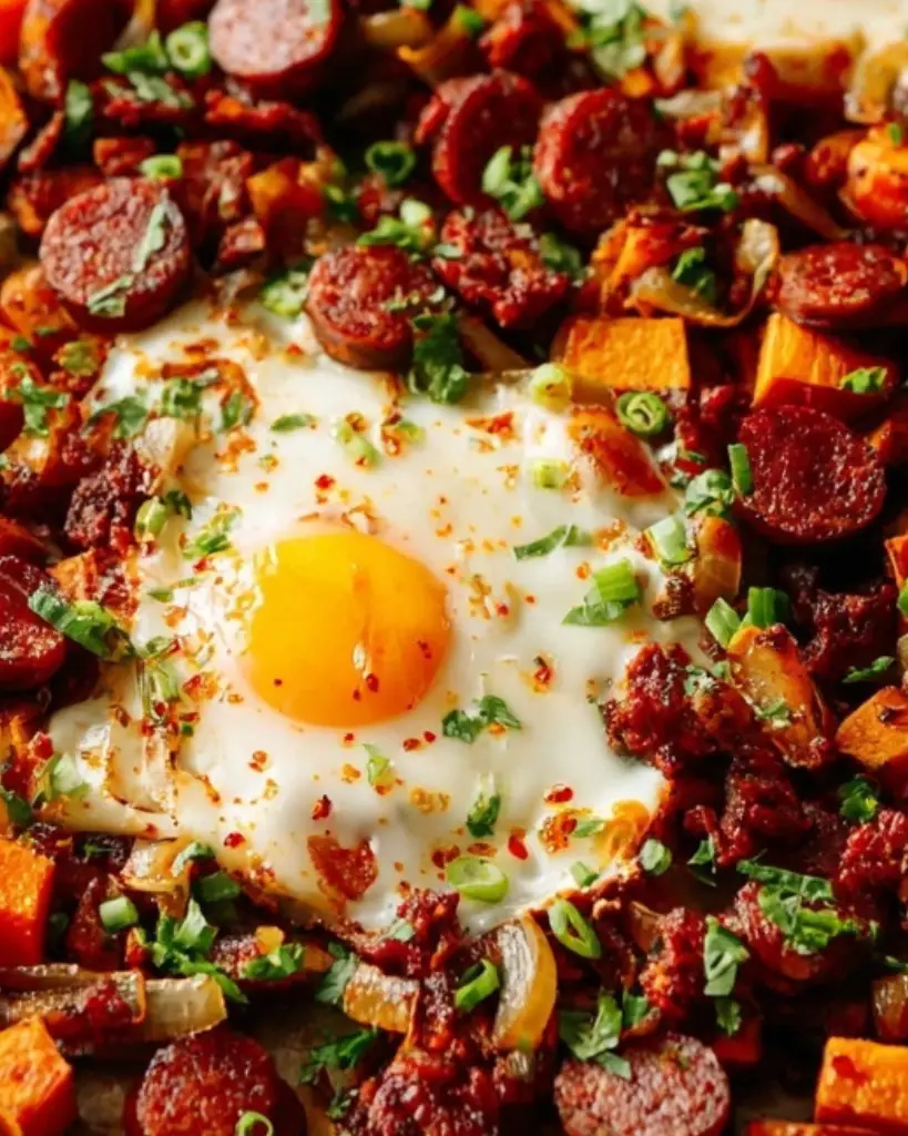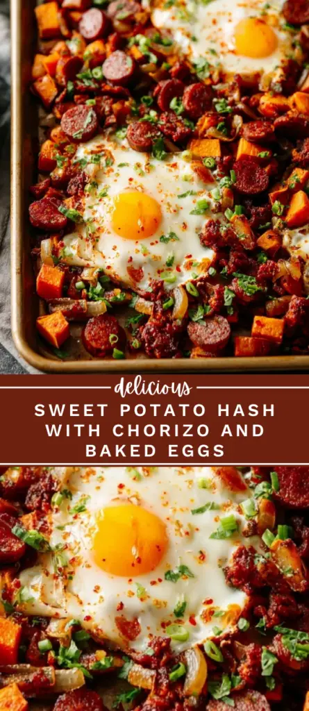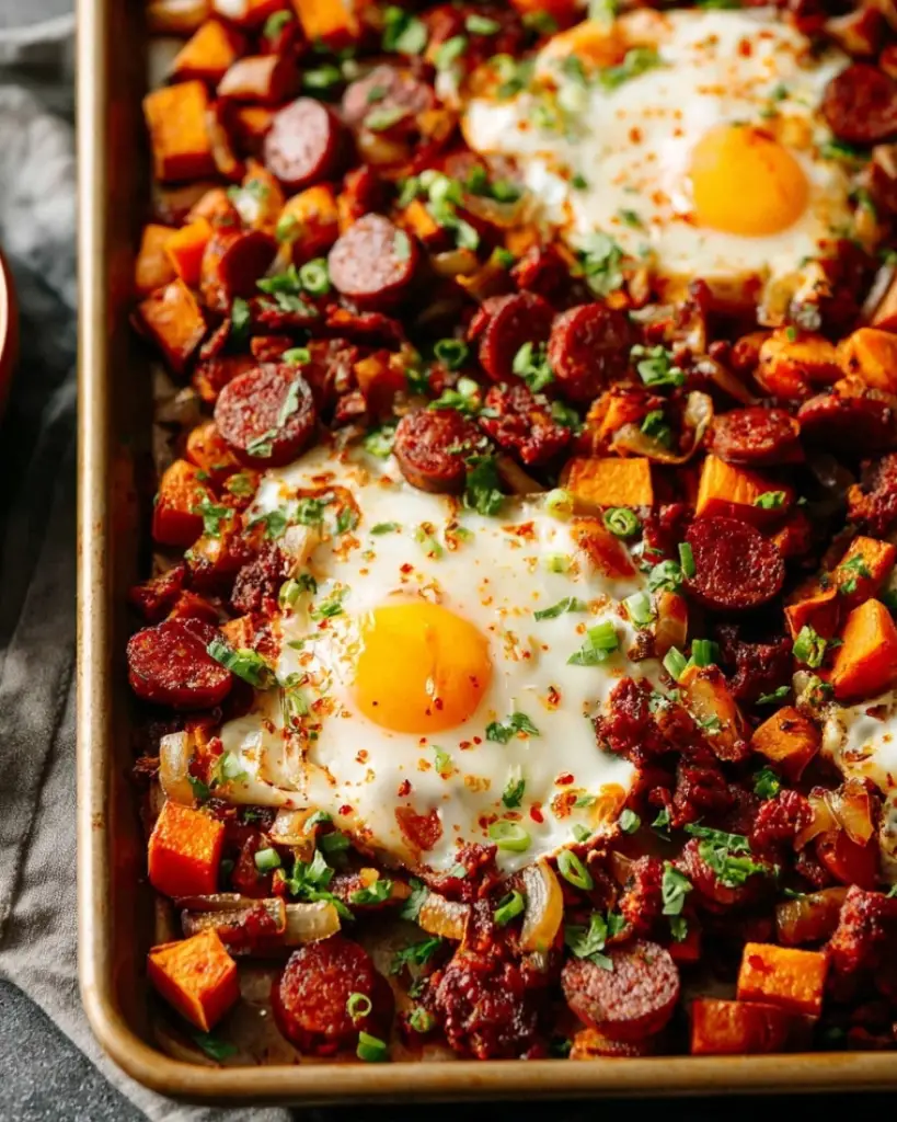 This sweet potato hash with chorizo and eggs is a flavorful one-pan meal perfect for breakfast, brunch, or a quick dinner. Roasted sweet potatoes, smoky Spanish chorizo, caramelized onions, and baked eggs create a hearty dish packed with bold flavor. Made with simple ingredients and roasted on a sheet pan, this easy sweet potato breakfast hash recipe is ideal for busy mornings or weekend brunch. The combination of crispy sweet potatoes, savory chorizo, and runny eggs makes this recipe a satisfying healthy breakfast skillet that the whole family will love.
