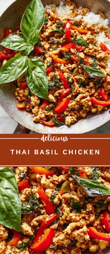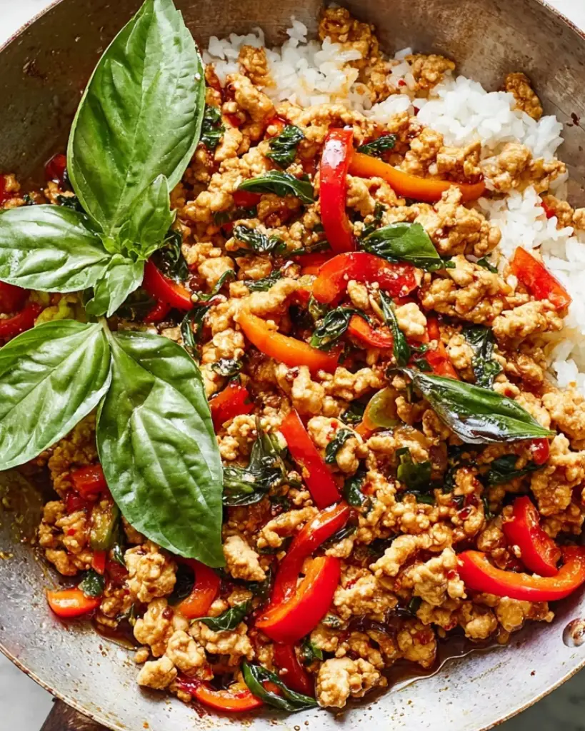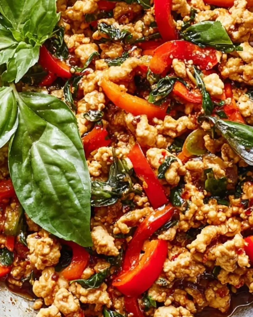 This Thai Basil Chicken recipe features ground chicken stir-fried with garlic, ginger, bell peppers, and fresh basil in a savory sauce made with soy sauce, fish sauce, oyster sauce, and chili. Served over Jasmine rice, this dish delivers authentic Thai flavors in a quick and easy weeknight meal. Perfect for home cooking, it’s a flavorful, protein-rich dinner option that can be customized with vegetables and adjustable spice levels.