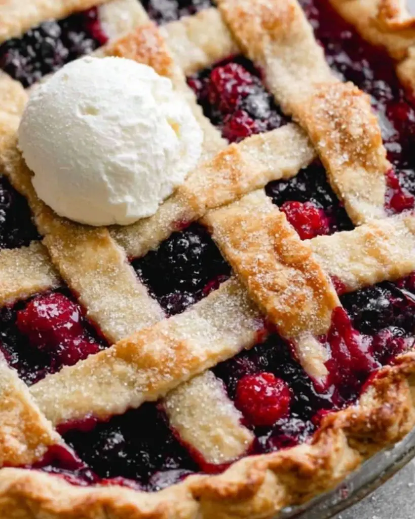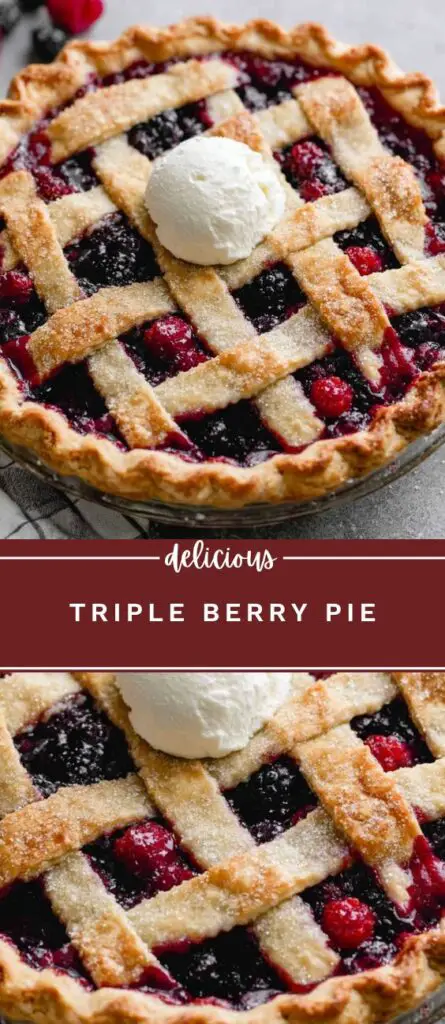 This homemade triple berry pie is filled with fresh or frozen raspberries, blueberries, and blackberries in a sweet-tart filling baked inside a flaky pie crust. Perfect for summer desserts, holidays, or family gatherings, this mixed berry pie is easy to make and can be topped with a lattice crust for a beautiful presentation. Serve with vanilla ice cream or whipped cream for a classic finish.