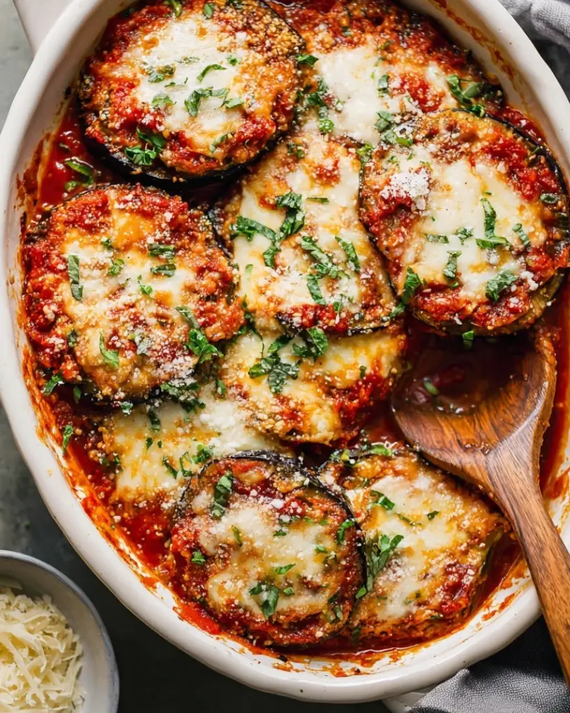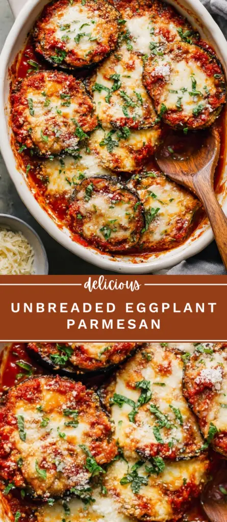 Unbreaded eggplant Parmesan is a lighter Italian-style baked casserole made with roasted eggplant slices, tomato sauce, mozzarella, and Pecorino Romano cheese. This healthy eggplant Parmesan recipe skips frying and breadcrumbs, relying on oven-roasted eggplant for rich flavor and tender texture. Perfect for vegetarian dinners, meal prep, or family meals, this baked eggplant Parmesan is low carb, gluten-free, and packed with classic Mediterranean flavors. A popular meatless main dish that reheats well and works for weeknight cooking or special occasions.