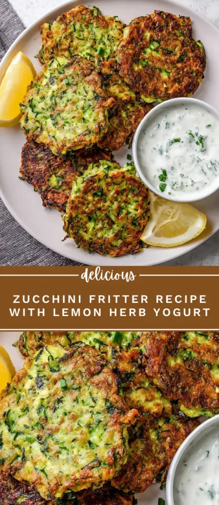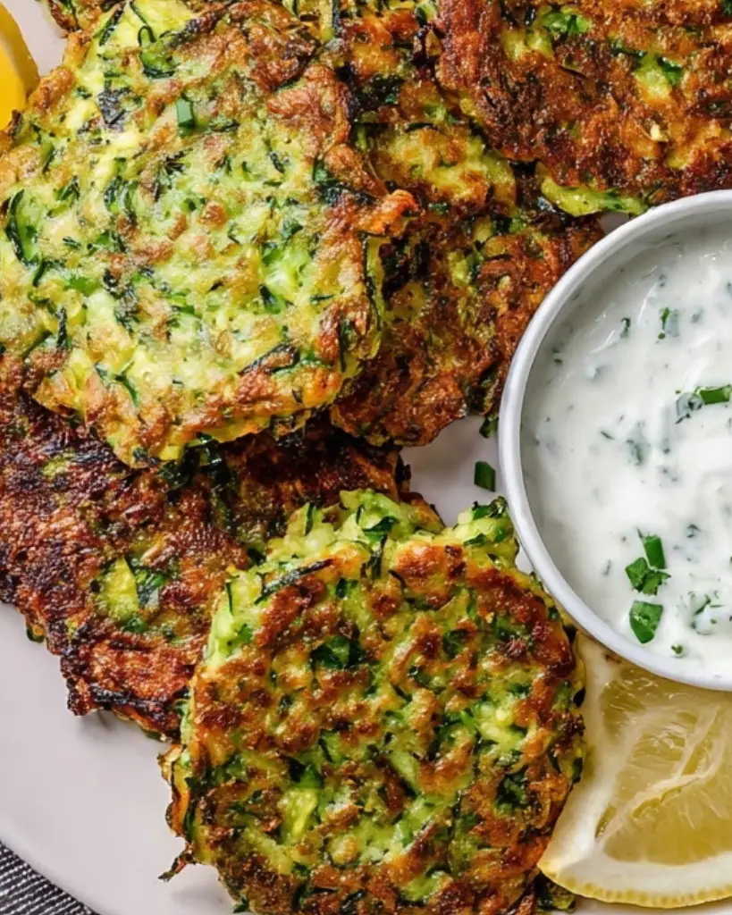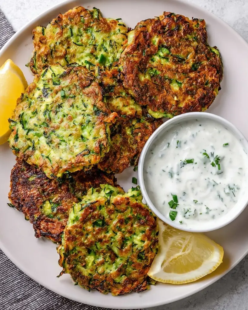 This zucchini fritter recipe features crispy pan-fried zucchini patties served with a refreshing lemon herb yogurt sauce. Made with grated zucchini, fresh chives, and simple pantry ingredients, these fritters are light, flavorful, and perfect for appetizers, snacks, or side dishes.